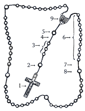 8. Announce the Second Mystery. Then pray the "Our Father." Repeat 6 and 7 and continue with the Third, Fourth, and Fifth Mysteries in the same manner.